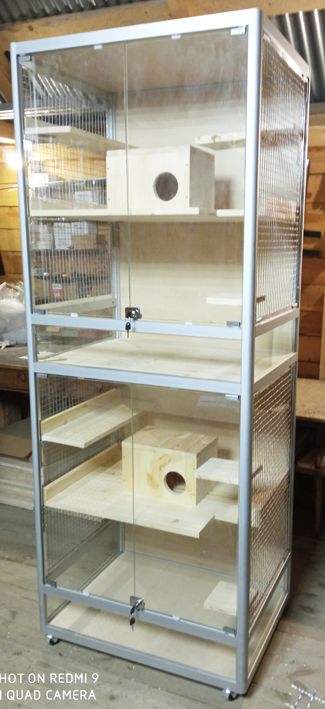 Двухэтажная клетка - витрина для шиншилл: ВхШхГ 200 (с колесами 206) х 80 х 60 см. Сетки с двух сторон, материал сеток - нержавеющая сталь марки 12Х18Н9 с размером ячейки 18х18 мм и толщиной прута 1,6 мм. Между этажами предусмотрен закрывающийся лаз. Цвет панелей - Акация лэйклэнд.