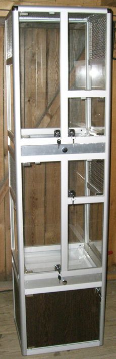 Двухэтажная витрина с тумбой для птиц: высота - 190 см, ширина - 50 см, глубина - 4 см. Высота тумбы - 40 см, жилых этажей - по 75 см. Фасад каждого этажа оборудован двумя дверками разных размеров. Вентиляционные сетки расположены в верхней части боковых стенок и на потолке второго этажа. Материал сеток - нержавеющая сталь. Вольер оборудован выдвижными поддонами для удобства уборки. Высота бортиков поддонов - 5 см.