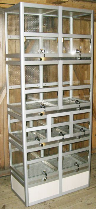 Витрина для зоомагазина, разделенная на 9 боксов для содержания различных видов животных и птиц. Внизу витрины предусмотрен подиум высотой 20 см. Общая высота витрины - 190 см, ширина - 80 см, глубина - 40 см. Высоты ярусов снизу вверх: 40 см, 30 см и два по 50 см. На фасаде расположены дверки и выдвижные поддоны. Над поддонами установлены сетки. Вентиляционные сетки расположены на задней стенке. Материал сеток - нержавеющая сталь.