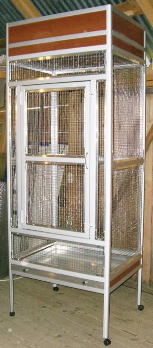 Вольер для попугая какаду: высота жилой части - 170 см, ножки с колесами - 40 см, двойной фальш-потолок - 30 см. Ширина вольера - 90 см, глубина - 70 см. Все стенки - сетка из нержавеющей стали. В фальш-потолке установлены два светильника, защищенные сетчатым потолком. Потолок и панели потолочного фриза - ЛДСП. Цвет панелей - вишня Виктория. Вольер оборудован выдвижным поддоном. Пол поддона - закаленное стекло 5 мм.