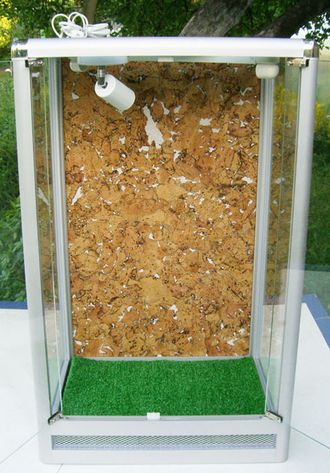 Террариум для содержания хамелеона. Высота - 80 см, ширина - 50 см, глубина - 40 см. Комплектация: пробка на задней стенке, светильник обогрева под лампы с цоколем Е27, светильник под УФ лампу 15 Вт, коврик на полу. Пол изготовлен из стекла 5 мм.