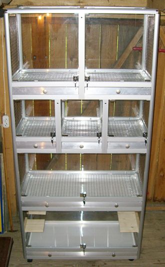 Витрина для зоомагазина. Общая высота - 200 см, ширина - 100 см, глубина - 45 см. Высоты этажей (снизу вверх): 50 см, 50 см, 40 см, 60 см. Полы перекрытий между отсеками и полы выдвижных поддонов - сотовый поликарбонат 8 мм. Вентиляционные сетки расположены на потолке и боковых стенах витрины. Полы над поддонами и внутренние перегородки также выполнены из сетки. Вся сетка из нержавеющей стали 12Х18Н9 с ячейкой 10х10 мм и толщиной прута 1,6 мм. Задняя стенка - стекло.