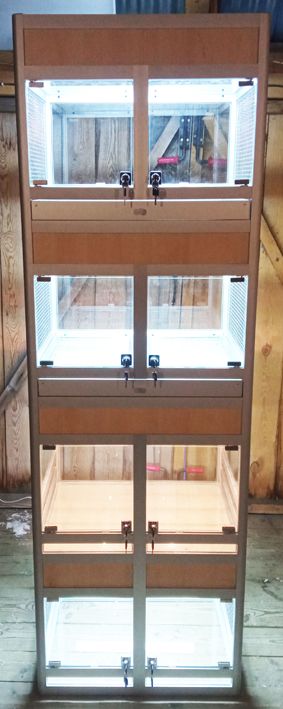 Витрина для зоомагазина, разделенная на 8 боксов для содержания различных видов животных. Общая высота витрины - 200 см, ширина - 65 см, глубина - 50 см. Высоты всех жилых боксов по 35 см. Два верхних этажа имеют выдвижные поддоны с сетками над ними. Вентиляционные сетки расположены на боковых стенках. Материал всех сеток - нержавеющая сталь 12Х18Н9 с ячейкой 10х10 мм. Цвет панелей фризов фальш-потолков и потолка витрины - клен. Внутренние перегородки нижнего и двух верхних этажей - стекло, второго этажа - сетка. Второй этаж предназначен для содержания рептилий и в нем организована проточная вентиляция, в фальш-потолке установлены светильники для УФ лампы и ламп обогрева, а от жилой части они отделены потолком из сетки. На остальных этажах в фальш-потолках установлены светодиодные светильники для обычной подсветки, которые отделены от жилой части съемными потолками из стекла.