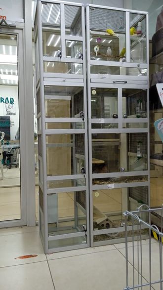 Витрина для зоомагазина. Общая высота - 210 см, ширина - 40 см, глубина - 45 см. Высоты этажей (снизу вверх): 50 см, 50 см, 40 см, 70 см. Полы перекрытий между этажами - стекло 5 мм с герметизацией периметра. Вентиляционные сетки расположены на боковых стенах и потолке витрины. Вся сетка из нержавеющей стали 12Х18Н9 с ячейкой 10х10 мм и толщиной прута 1,6 мм. Задняя стенка, внутренние перегородки и дверки - стекло. Подсветка боксов в данной витрине не предусмотрена.