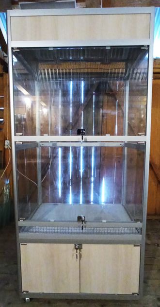 Вольер для игрунки. Размеры: высота - 170 см (с колесами - 176 см), ширина - 80 см, глубина - 55 см. Высота фальш-потолка - 20 см. В фальш-потолке установлены три светильника: один - для УФ-лампы и два - для ламп подсветки и обогрева. Кнопки управления светильниками расположены на правом боковом фризе фальш-потолка. Задний фриз оставлен открытым для осуществления эффективной вентиляции. Фальш-потолок отделен от жилой части сеткой. Материал сеток - нержавеющая сталь. Цвет панелей ЛДСП - акация лэйклэнд.